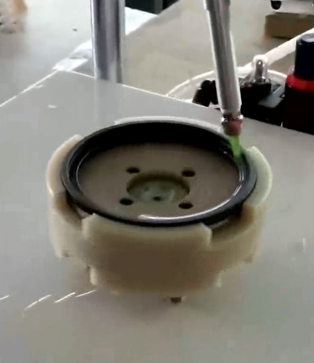 根据产品的外型尺寸按比例制作出相对应的产品模具,由马达带动模具旋转产生涂胶轨迹,实现产品圆周均匀涂胶。